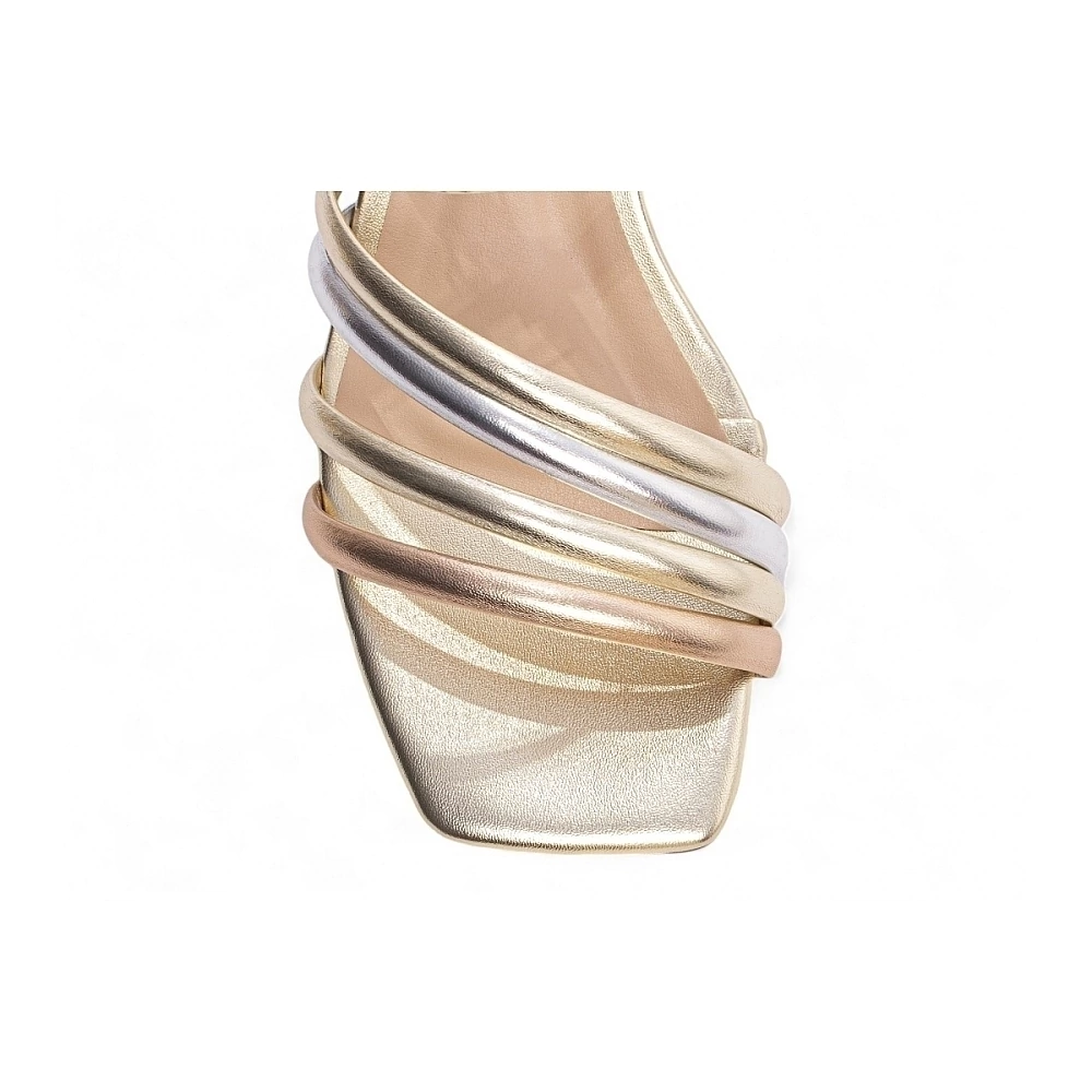 Palmilha: 8 mm de Espessura, Espuma em EVA, Revestida em Napa Metalizado Ouro Ligth e Taloneira Napa Bege;