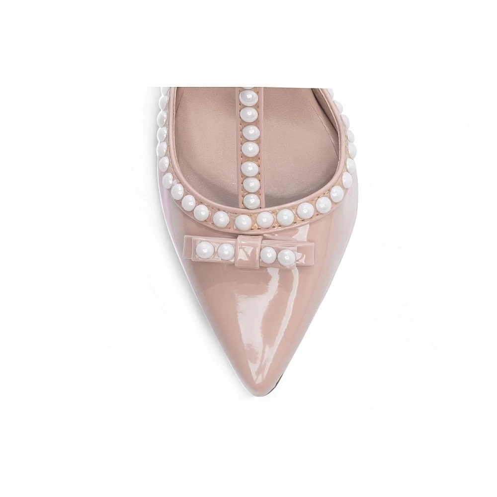 Palmilha: 8 mm de Espessura, Espuma em EVA, Revestida em Verniz Rose e Taloneira Napa Bege;